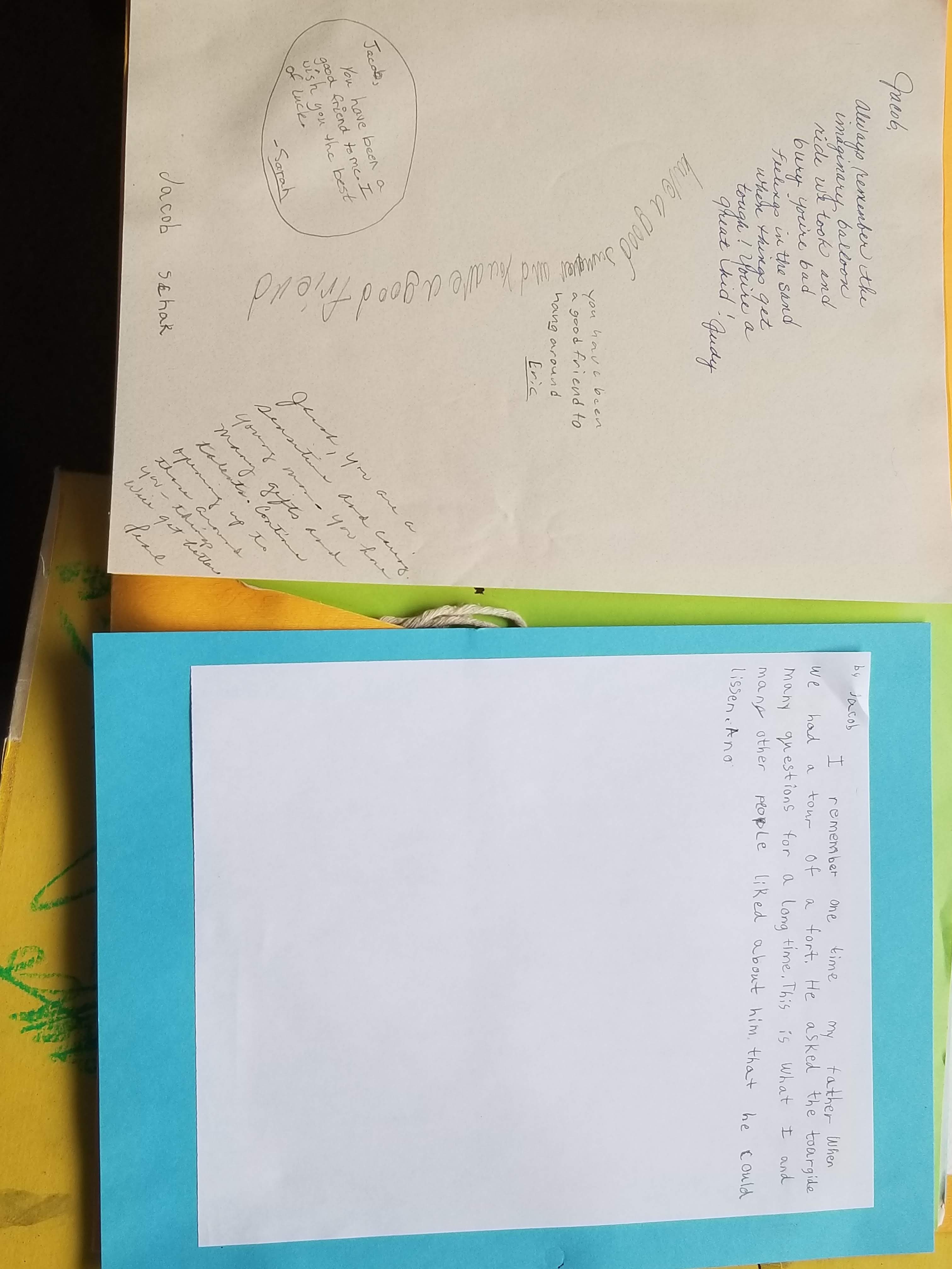 Bereavement support group. After my father passed away, my mom, brother, and I each joined a support group with peers who had recently lost family. I was quite fond of my group, the pre-teens. One day, all of us in the group wrote down affirmations for other members to keep on-hand for a rainy day. Fast forwarding to 2022, it was such a treat to find these notes stashed away from my grief-partners. Sarah and Eric—I want you to know you are being thought of and loved after all these years.